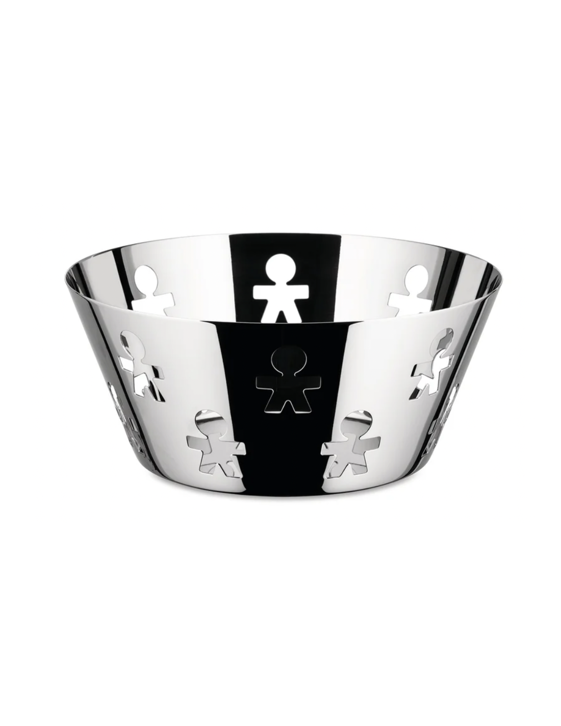 El motivo de muñecas de papel recortadas creado por el dúo de diseñadores Stefano Giovannoni y Guido Venturini, conocidos bajo el nombre de King-Kong, adorna una variedad de objetos cotidianos como la canasta de acero inoxidable Girotondo.
