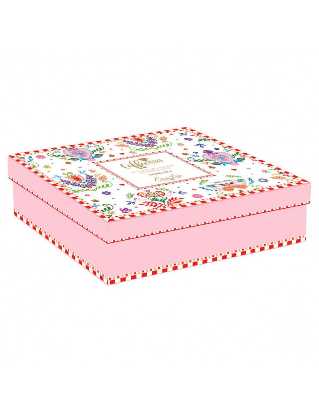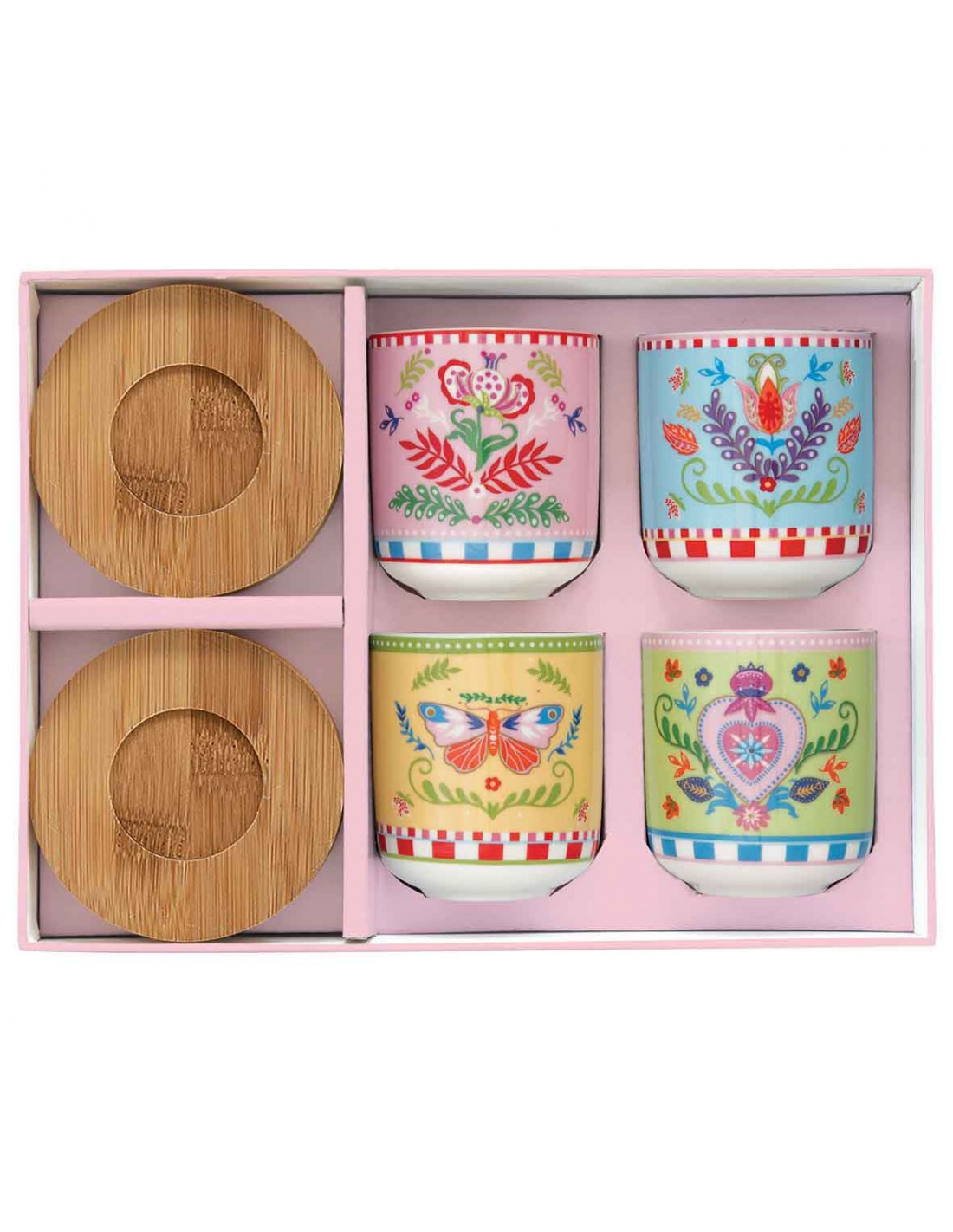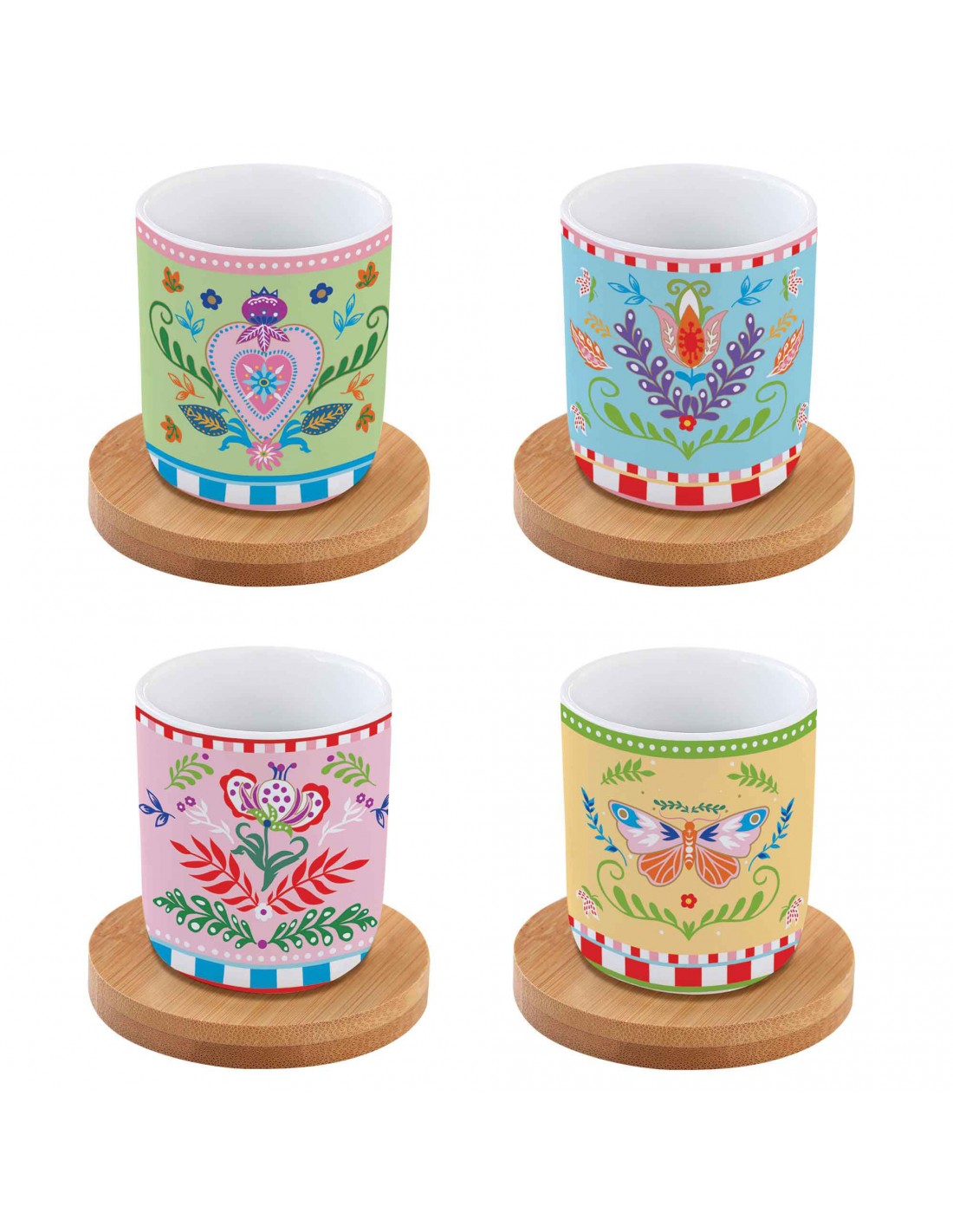 Juego de 4 tazas de café de porcelana Easy Life con platillos de bambú, colección Spring Folk