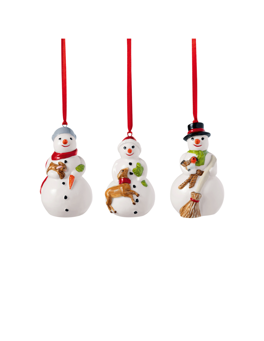 Un conjunto de juguetes para árboles de Navidad de tres muñecos de nieve hechos de porcelana. Estas decoraciones de la colección Nostalgic Ornaments le darán al árbol de Navidad festivo un ambiente tradicional y acogedor. Los juguetes están hechos de alta calidad y son geniales para coleccionar o regalar.