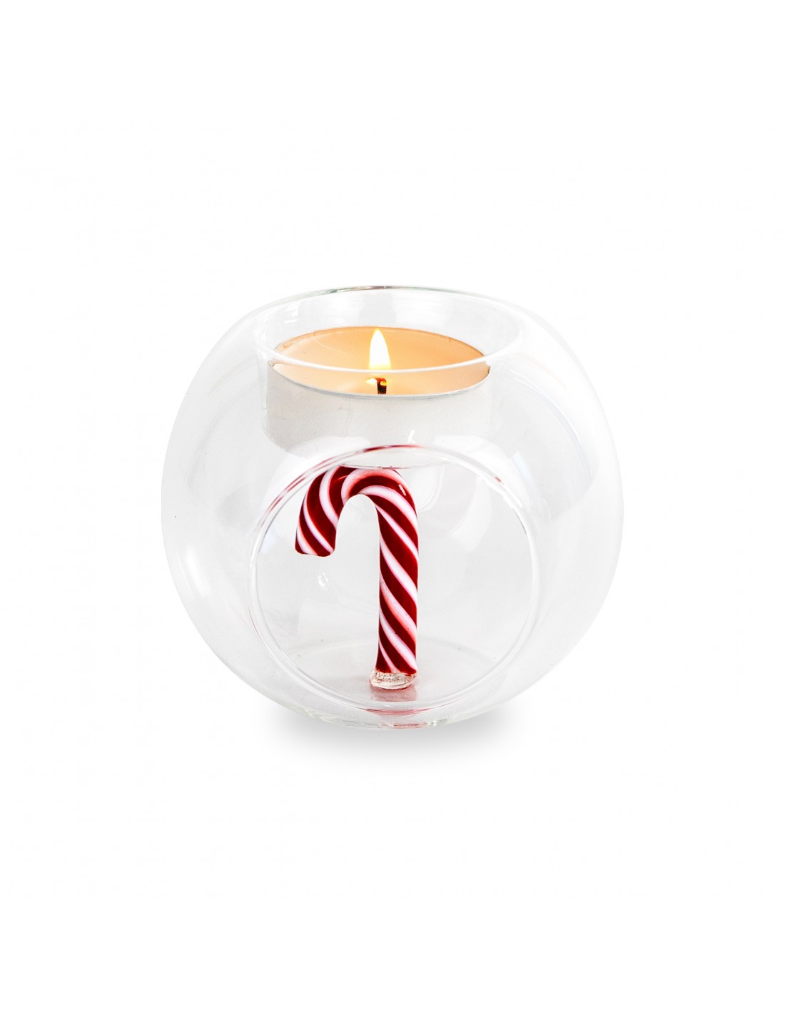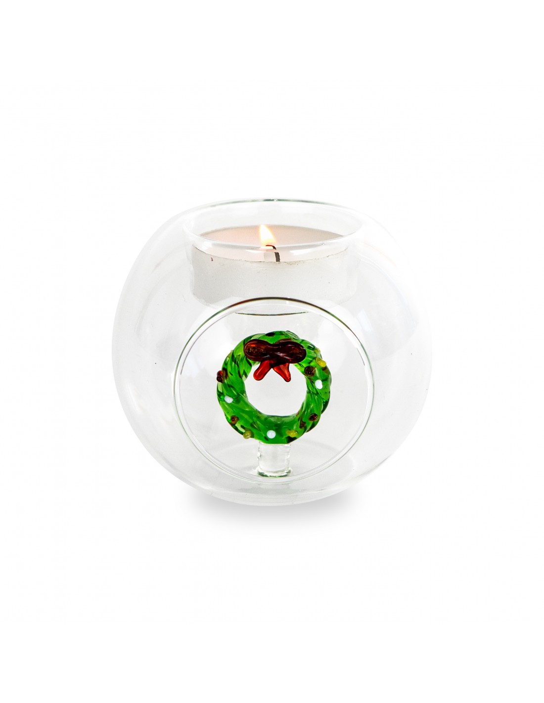 Portavelas de vidrio de borosilicato con decoración navideña artesanal. Recomendamos usar velas con revestimiento de aluminio. Vela no incluida.