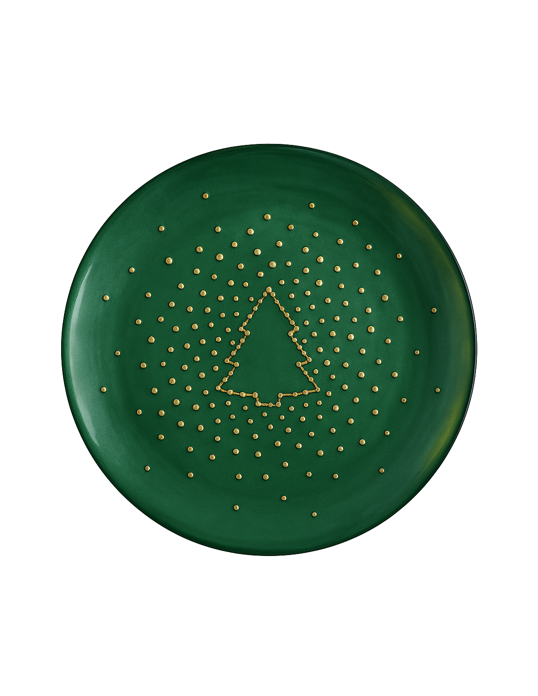 Plato de postre en tono verde esmeralda con diseño central de árbol de Navidad delineado en detalles dorados. Perfecto para realzar la mesa durante la temporada navideña con un toque moderno y festivo.