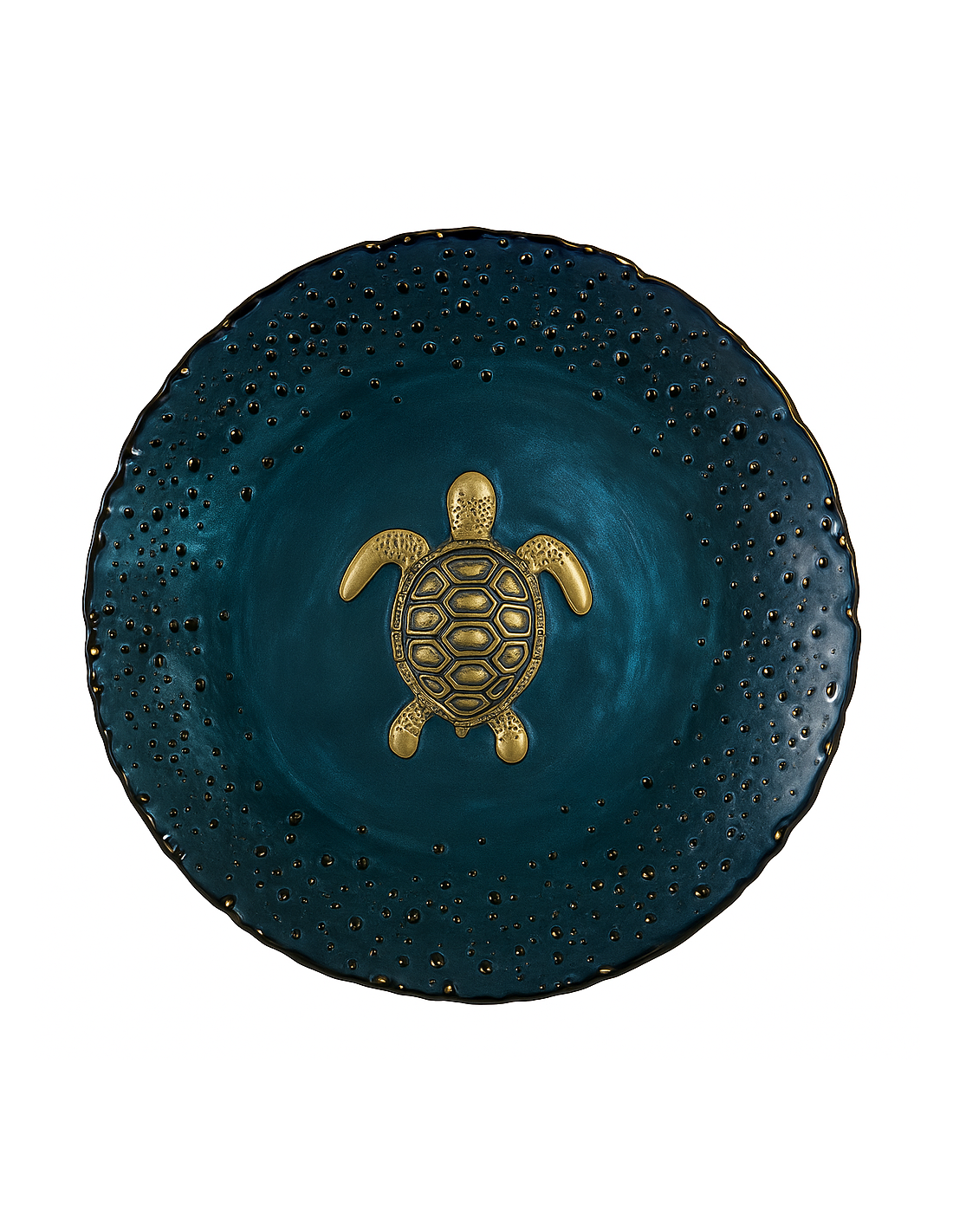Plato profundo en tono azul cobalto con borde texturizado y figura central de tortuga en dorado. Una pieza llamativa y contemporánea que aporta sofisticación y personalidad a cualquier mesa.
