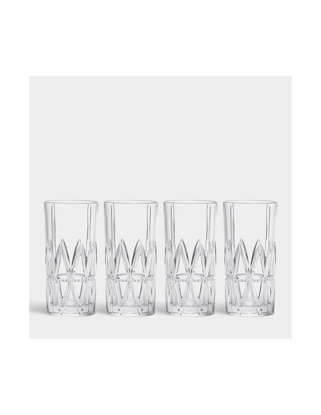 Peak Highball de Orrefors, disponible en un juego de 4, tiene una capacidad de 12,5 onzas y es un vaso de bar ideal para tragos largos. El motivo del vaso está inspirado en los majestuosos picos de las montañas de las regiones del norte de Escandinavia. Diseñado por Martti Rytkönen.