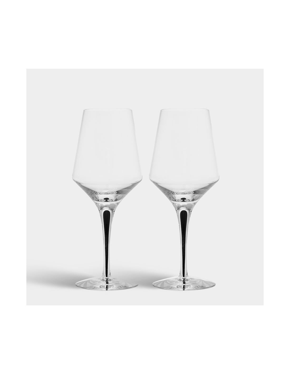 Metropol White Wine de Orrefors, disponible en un juego de 2, tiene capacidad para 13,5 onzas y es ideal para todos los vinos blancos. La copa de vino está soplada a boca en Suecia por expertos sopladores de vidrio y se inspira en el diseño clásico Intermezzo de Erika Lagerbielke, pero con una gota de negro sellada dentro del tallo y un cuenco con una forma más angular y austera.